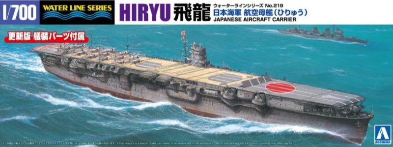This 1/700 scale kit from Aoshima recreates the IJN Hiryu with focus on accurate deck plan and hull lines. The kit suits modellers who want a compact yet detailed representation of a significant World War II carrier.