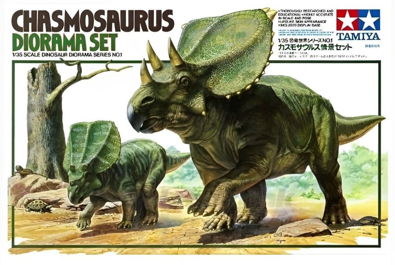 The Tamiya 1/35 Chasmosaurus kit recreates a slice of late Cretaceous life, centring on the distinctive frilled Chasmosaurus. The model reflects palaeontological shapes and proportions while offering a compact display scale suited to shelves and cabinets.