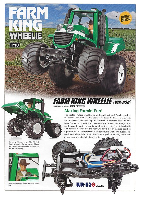 This R/C arranged kit recreates the hard-working mainstay of farm life, the tractor. The poly-carbonate human anatomy features a comically-styled front mask over bonnet, a considerable plow in the rear and exhaust pipelines on either part of the driver's seat. a driver figure with ten-gallon limit may also be included. The WR-02G framework features huge obligation monocoque framework that will be loaded with 97mm and 130mm diameter tires regarding front component and right back correspondingly for an authentic scale existence. The engine lies over the center-line associated with the framework and power is provided for a large part tires via fully-enclosed gearbox designed with a gear differential. 4-wheel double wishbone suspension produces practical technical motion. The WR-02G is designed with a wheelie bar make it possible for enjoyable, tires floating around driving action.