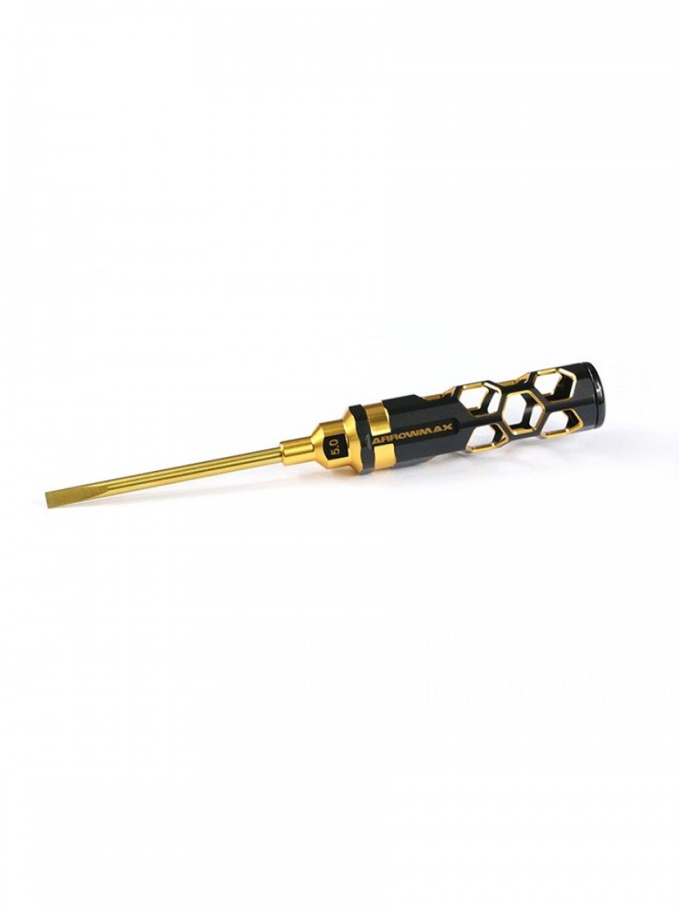 The Arrowmax AM-430151-BG screwdriver delivers a precise 5.0 x 100mm flat head ideal for detailed RC assembly and maintenance. Its length and tip profile make it useful for adjusting electronics, body fittings, and tight hardware locations.