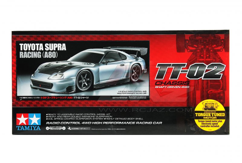 The lightweight polycarbonate body captures the A80 profile while remaining tough enough for regular track use. Molded mirror parts and a separate rear wing add scale presence. Factory six-spoke wheels and slick tyres provide the intended road feel, while the combination of a 4-bevel differential and independent double wishbone suspension keeps handling smooth and controllable.